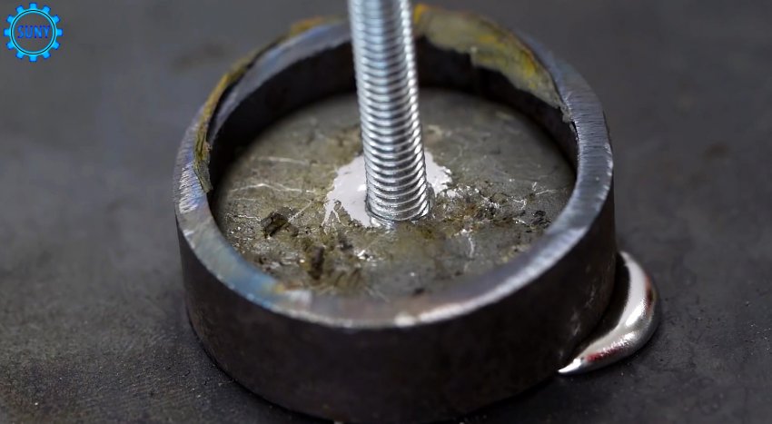 Укладываем кольцо на металлический лист, и закладываем в него свинец. После этого греем его горелкой. Когда свинец расплавится, окунаем в жидкий металл болт головкой вниз. Важно чтобы основание под кольцом было горизонтальным, а болт на время застывания свинца минуту находится строго вертикально.