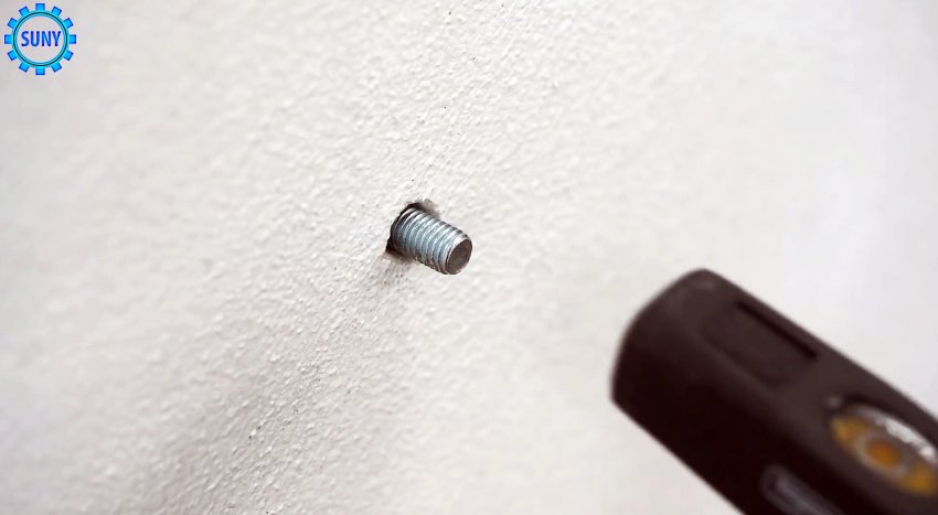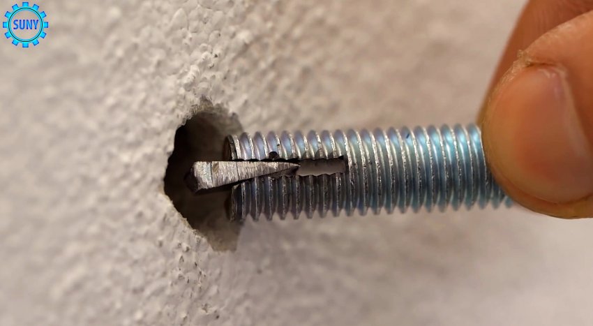 Вгоняем клин в разрез стержня, и помещаем его в отверстие в бетоне. Затем молотком забиваем его внутрь. Клин разопрет стержень, и тот уже не выйдет обратно.