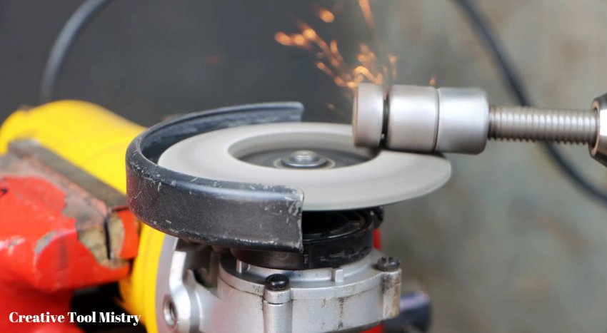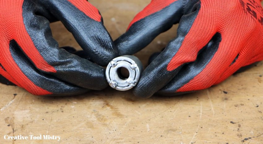Теперь вкручиваем острый болт в съемник, и он готов к использованию. Упираемся острием в вал, на который посажен подшипник, а зацепы заводим за внешнюю обойму. При закручивании болта цепи стягивают подшипник.