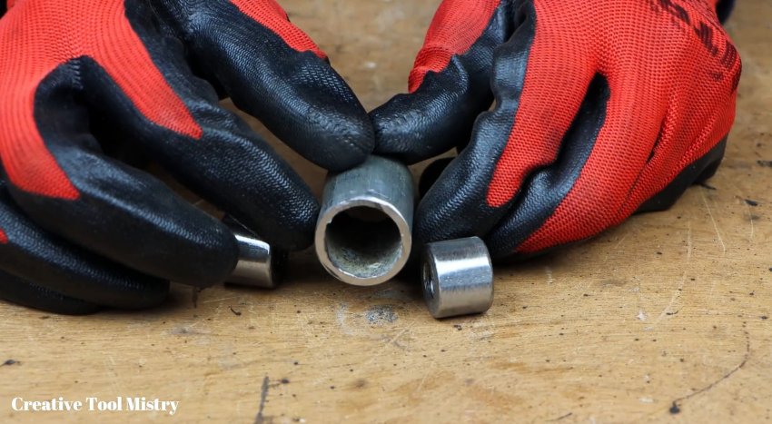 Отрезаем кусок трубки 1/2 дюйма длиной 50 мм, вставляем в нее обточенные гайки и ввариваем их по краям. Варить нужно с вкрученным болтом, так все будет ровно и шаг резьбы между ними совпадет.