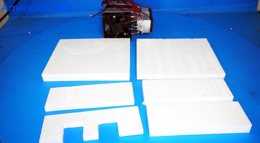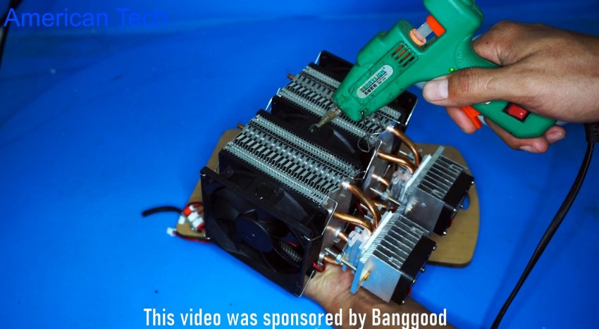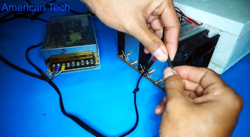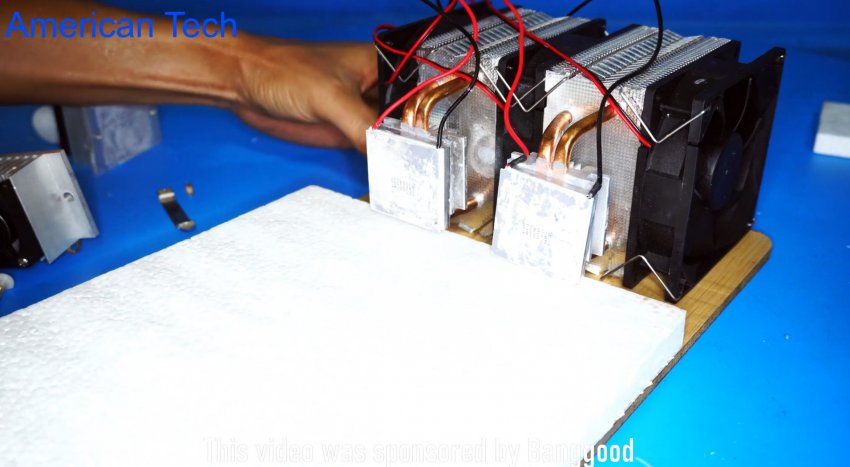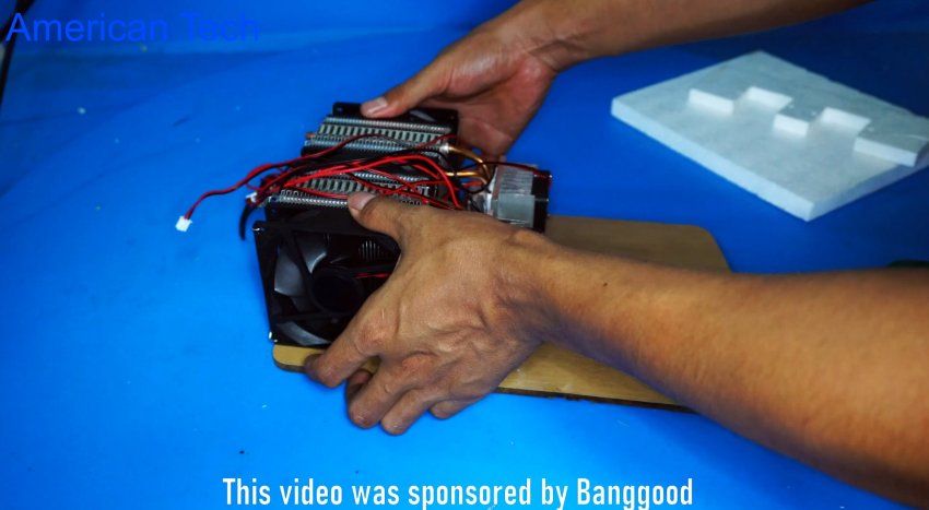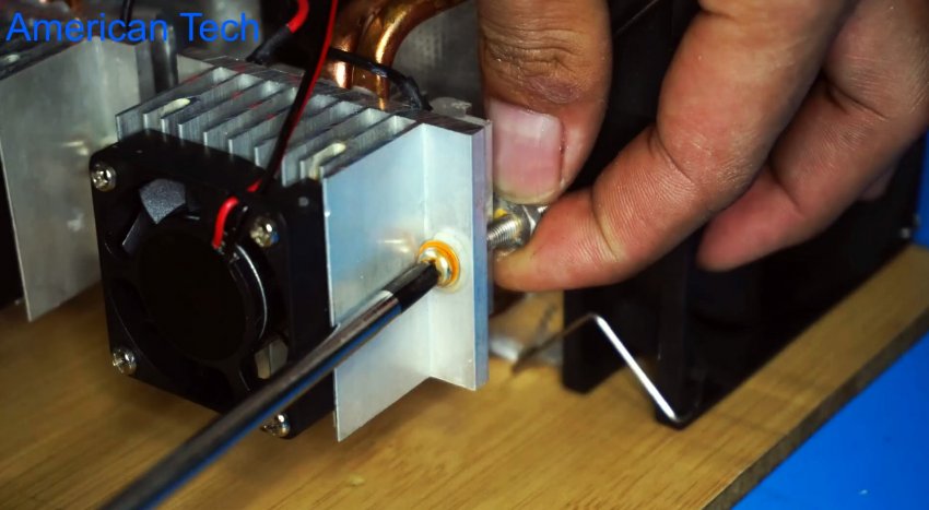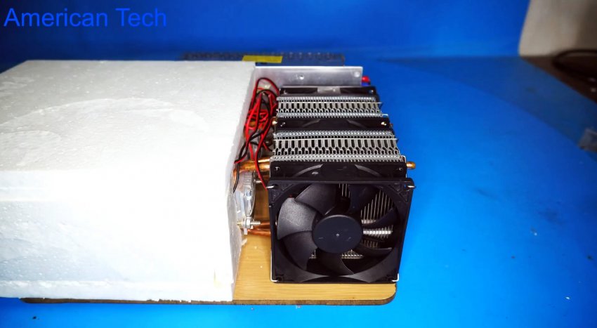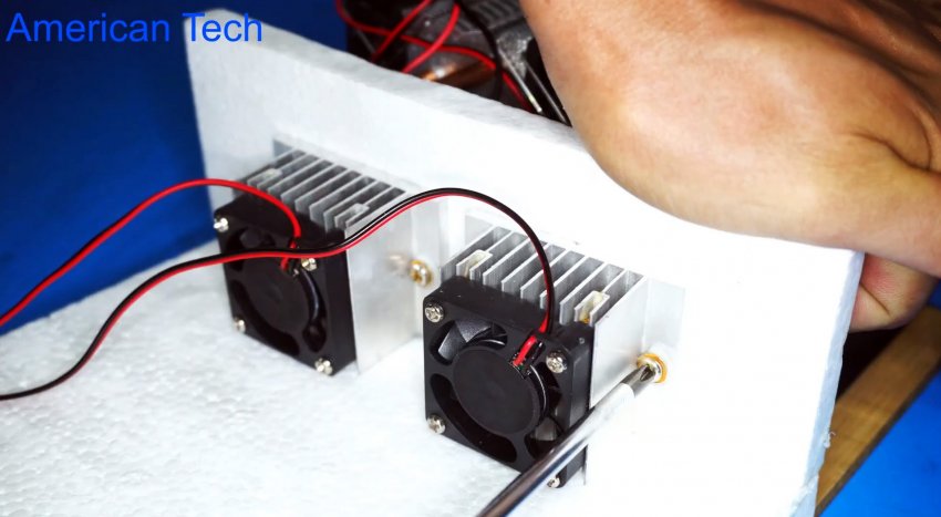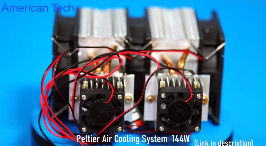 Сам генератор холода покупной, готовый, но никто не мешает его собрать самому. Система состоит из двух одинаковых модулей, которые в свою очередь состоят из двух радиаторов разных размеров с кулерами, между которыми зажат сам элемент Пельтье. Если вы не знаете что такое элемент Пельтье, то рекомендуем почитать справочный материал в интернете.