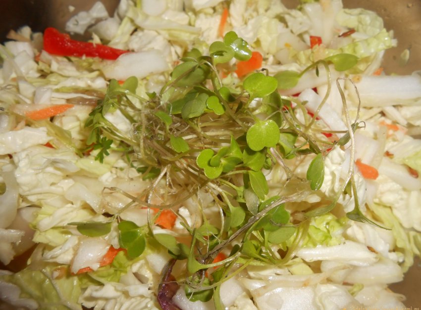 Собственноручно и с любовью выращенную микрозелень я добавляю в зимние салаты, например, из пекинской капусты, сельдерея и моркови.