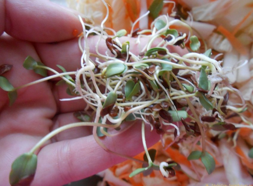 Красивые белесые ростки с двумя круглыми семядольными листочками на верхушке хорошо смотрятся в качестве украшения холодных и теплых закусок, в том числе бутербродов, мясной и сырной нарезки.