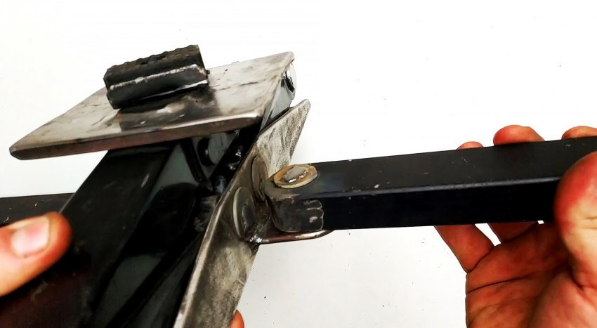 К концам дополнительных ножек привариваем снизу отрезки шпильки, чтобы обеспечить 4 точки опоры, лежащие в одной плоскости, а к шарнирной стороне – ограничительные упоры в виде узких пластин.