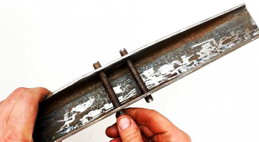 Сверху на края опорных ножек привариваем детали в виде П-образных скоб (креплений) с отверстиями.