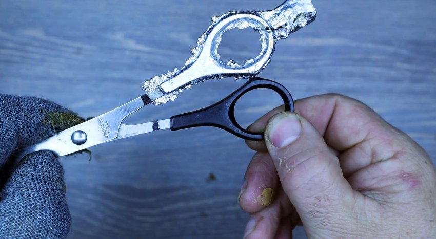 Разворачиваем фольгу и вытаскиваем отливку, с которой удаляем облой и литник, и получаем идеальное кольцо с впаянной в него ножкой. Отремонтированные ножницы прослужат еще не один год.