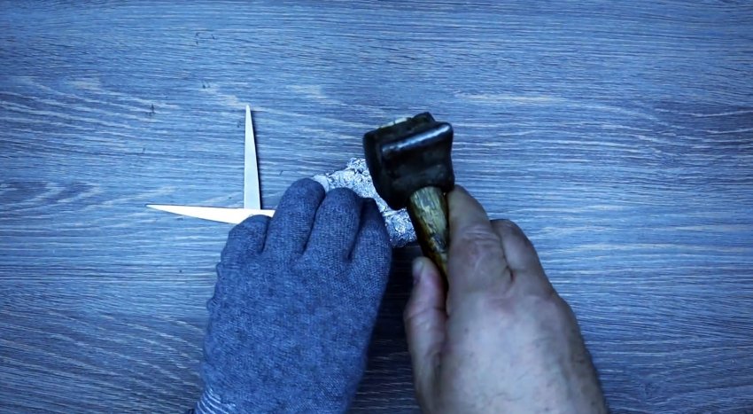 На одну из них укладываем кольцо, прикрываем другой половинкой и без особых усилий обстукиваем фольгу молотком. Далее формовку продолжаем пальцами и ногтями, добиваясь того, чтобы фольга как можно точнее и плотнее облегала кольцо как изнутри, так и снаружи.