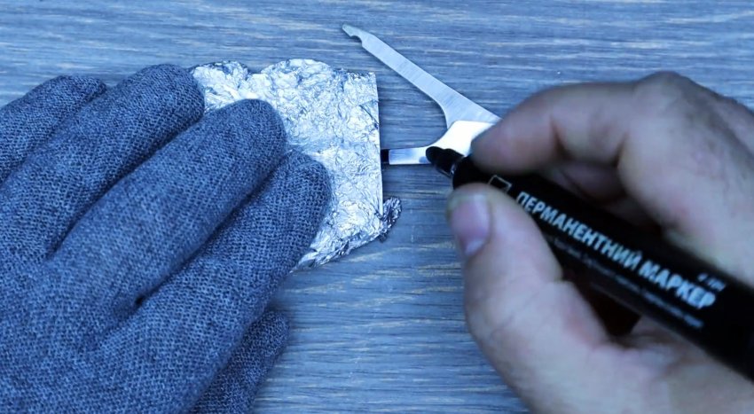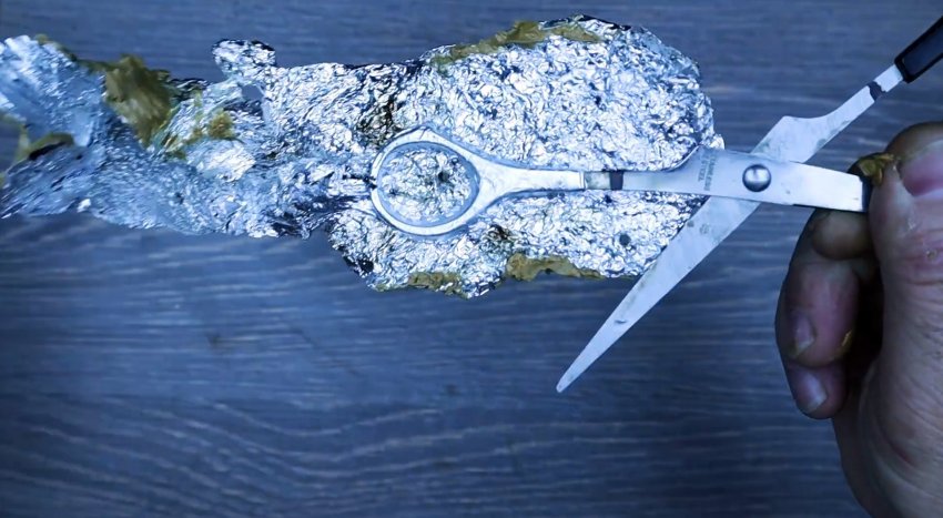 Переднюю часть формы из фольги отрезаем ножницами по прямой линии и маркером наносим метку контакта формы с ножкой ножниц.