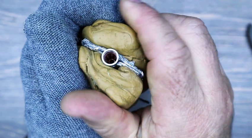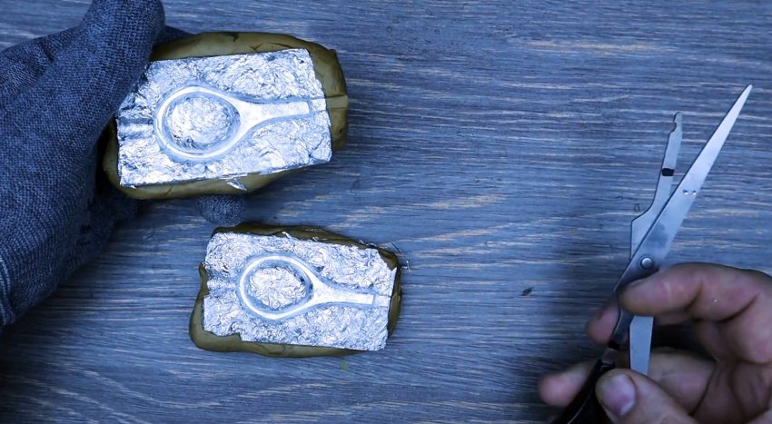 Форму из алюминиевой фольги с двух сторон обкладываем пластилином, который будет не только удерживать форму от деформации во время заливки жидкого металла, но и поглощать образовывающееся при этом значительное количество тепла.