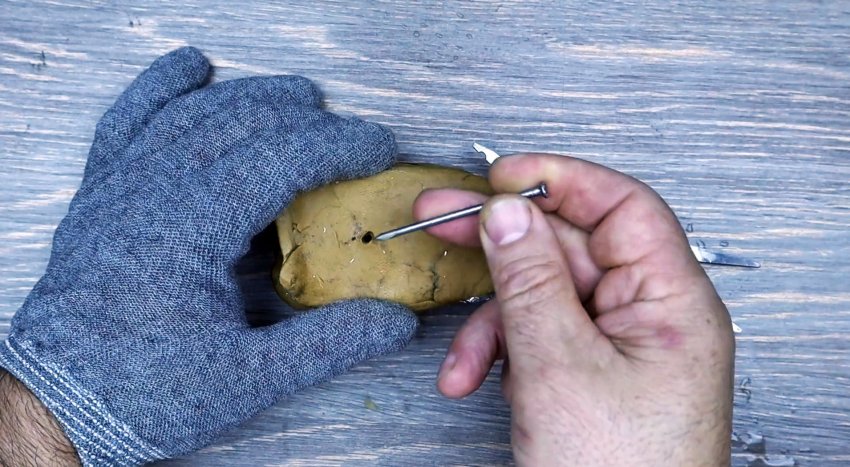 Чтобы части формы во время заливки металла не сместились, фиксируем их одним или даже несколькими металлическими гвоздями.