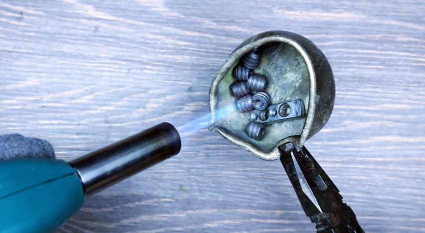 Укладываем в стальную емкость с «носиком» детали из сплава ЦАМ, который на 95% состоит из цинка, алюминия (4%) и меди (1%), и расплавляем в пламени газовой горелки.