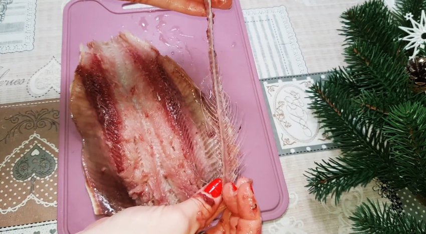 Смотрите подробное видео по удалению хребта и костей из селедки