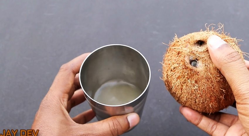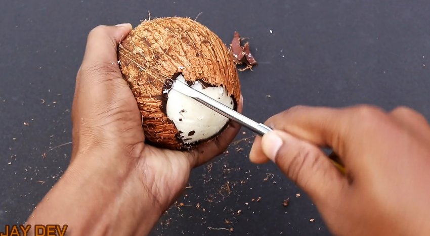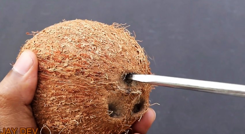 Если вам необходимо просто расколоть кокос на две половинки, данный лайфхак поможет. На каждом плоде есть пятна, которые легко прокалываются твердым предметом. Достаточно проколоть их отверткой и слить сок.