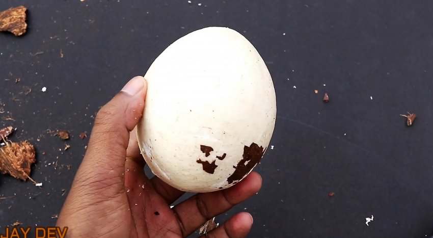 После изрядной заморозки внутренности стали одним целым, а скорлупа стала более хрупкой. Теперь достаточно нескольких ударов молотка, чтобы пошла трещина по всему плоду.