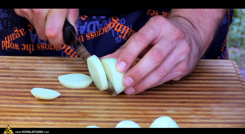 Мякоть мяса разрезаем на полосы, удаляя ярко выраженные жилы и пленку, а затем делим на куски с характерным размером около трех сантиметров.