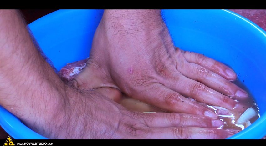 Затем содержимое емкости тщательно перемешиваем руками, чтобы ингредиенты будущего шашлыка пропитали друг друга соками и вступили в необходимые взаимодействия.