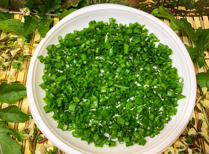 3. Подсушиваем перья тканевым полотенцем и нарезаем небольшими колечками.