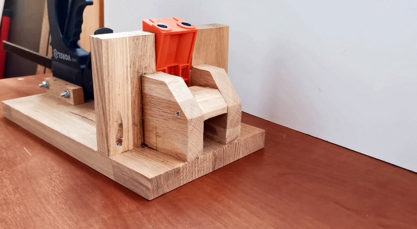 Используя регулировочный механизм на самом кондукторе, можно выставлять угол, под которым будет выполняться сверление. После этого заготовка прижимается к нему струбциной. В зафиксировано положении ее можно сверлить, исключая тем самым, что отверстия не совпадут между собой. Вся стружка при этом будет засасываться в пылесос.