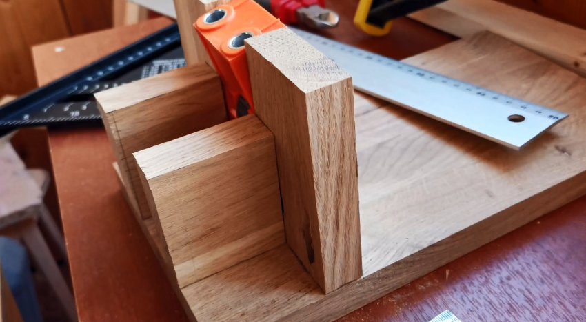 Из этого же материала нужно напилить 2 стойки, ширина которых совместно с кондуктором будет соответствовать ширине подошвы. Для крепления их следует засверлить под косой шуруп.