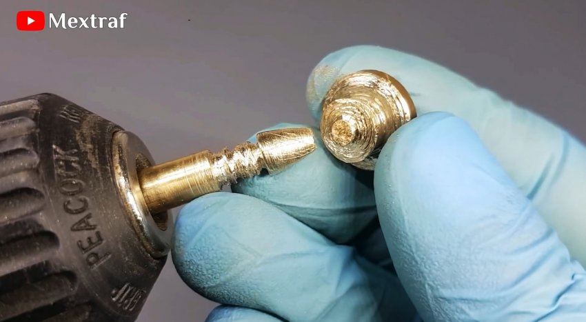 Зажимаем шток в патроне дрели или шуруповерта. Включаем на максимальные обороты и при помощи напильника стачиваем змеевидную резьбу.