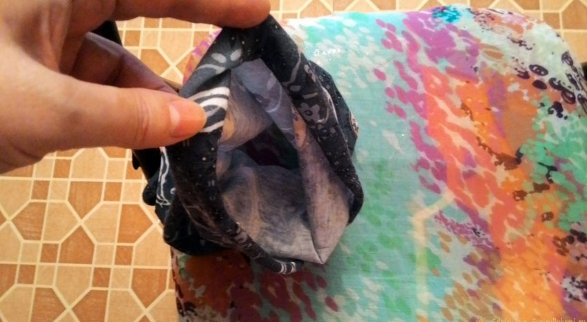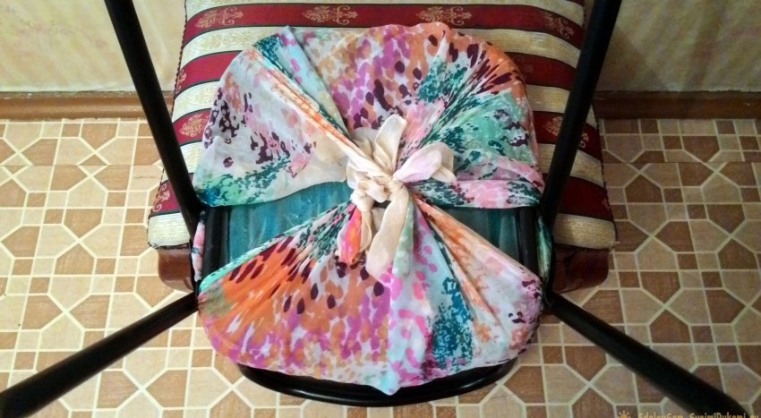 Кладу платок на сиденье стула, выравниваю края, чтобы не было перекосов. Затем переворачиваю стул, и завязываю платок за края наискосок. Всего получается 2 узла, которых не видно, если не заглядывать под стул. Завязывать узлы можно и снизу, не переворачивая стул, но для этого способа нужен помощник.