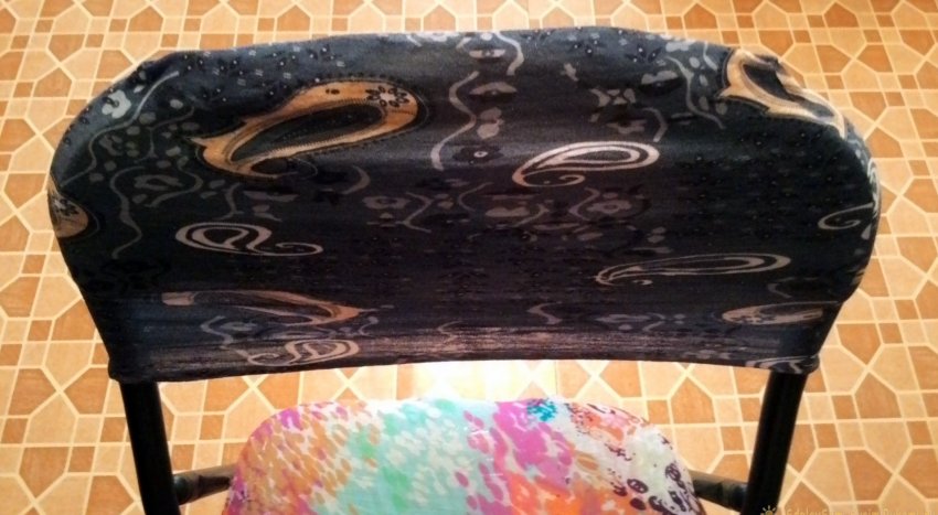 Осталось только натянуть материал на спинку и подогнуть или зашить сверху отрезанный край. Следите, чтобы швы от лосин в результате оказались по бокам спинки стула.