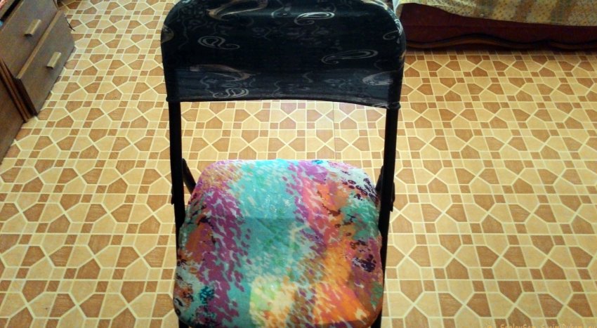 Для информации! Если у вас есть большого размера вещь, которая хорошо растягивается, вы можете задекорировать стул в одном цвете. В моем случае цвета разные, но для дачи этот вариант вполне приемлем. А, главное бесплатный, и стул спасли, и ненужные вещи пристроили.