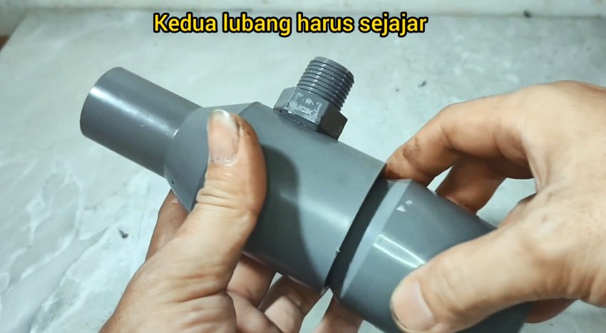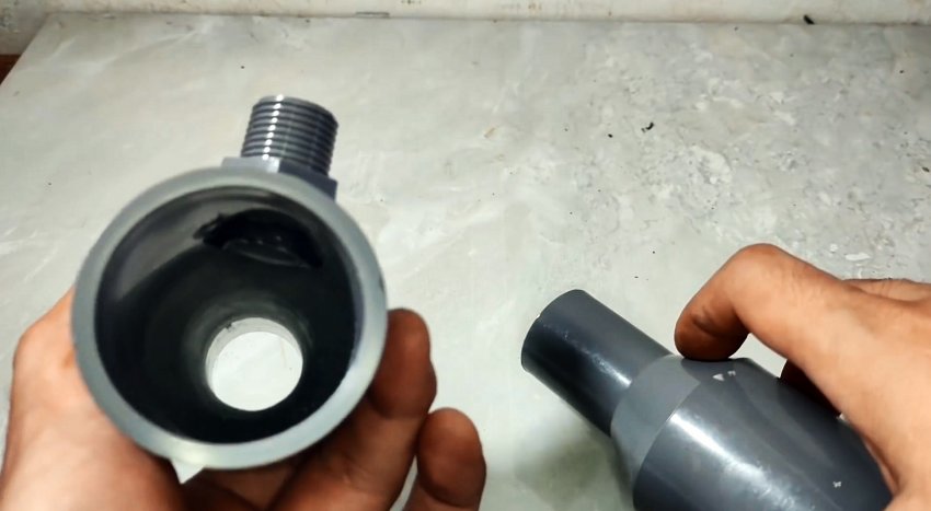 Во второй такой же муфте сбоку просверливается отверстие для вклейки ниппеля 1/2 дюйма. На сужении внутри в ней имеется ступенька, которую нужно предварительно сточить напильником. Затем в сделанное отверстие вклеивается укороченный ниппель с помощью эпоксидки.