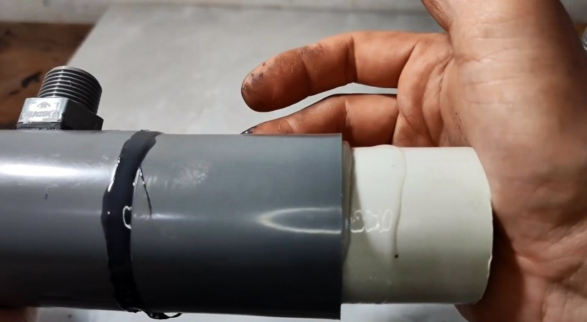 Первая муфта с вклеенной внутрь трубкой 3/4 дюйма вставляется во вторую муфту. Их линию стыка нужно пропаять паяльником, чтобы расплавить пластик по всей окружности. Затем она сверху замазывается эпоксидным клеем.