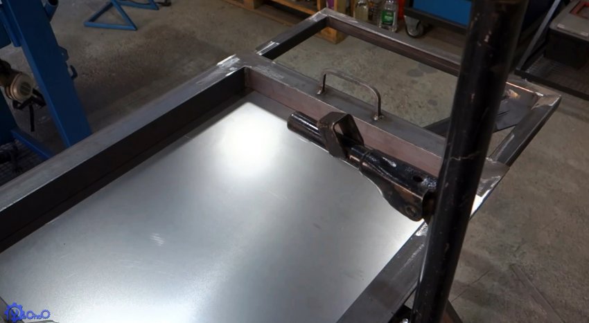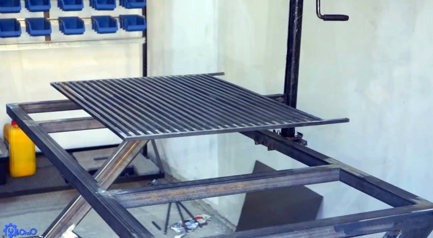 Для подъемного механизма решетки потребуется стоечно-винтовой домкрат. Его лапку нужно заварить, чтобы она находилась в откинутом состоянии. К рамке стола напротив центра жаровни приваривается площадка, к которой прикручивается подошва домкрата.