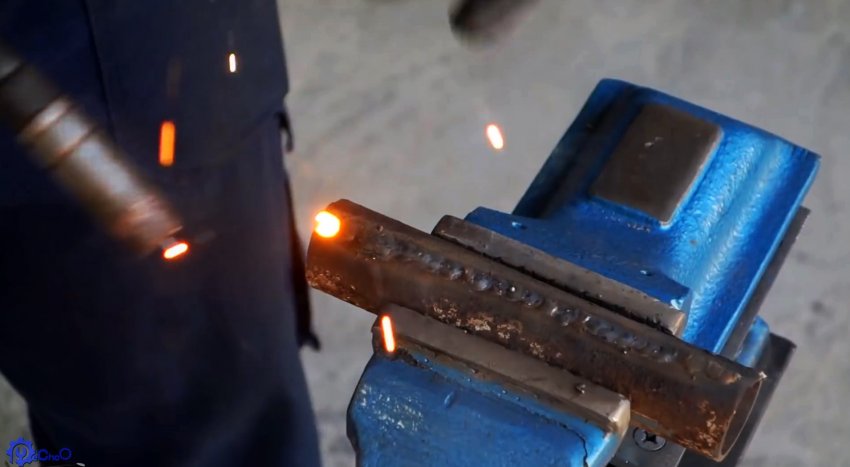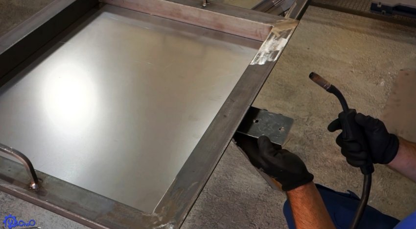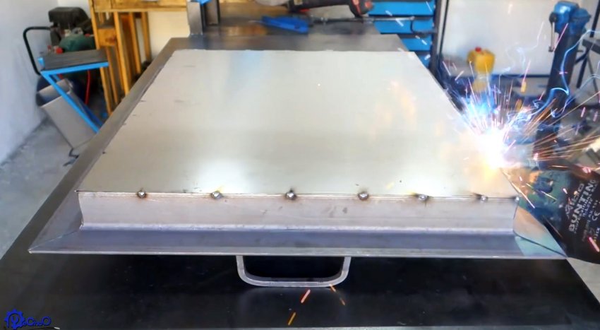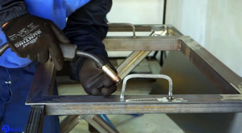 Из уголка сваривается рамка жаровни, которая будет вставляться в центральную ячейку основания столика. К ней привариваются ручки, согнутые из квадрата, и дно из листовой стали.