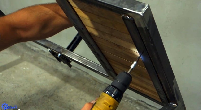Каркас окрашивается. На него прикручиваются доски. Под жаровню устанавливаются проставки с реек, чтобы она меньше грела каркас.