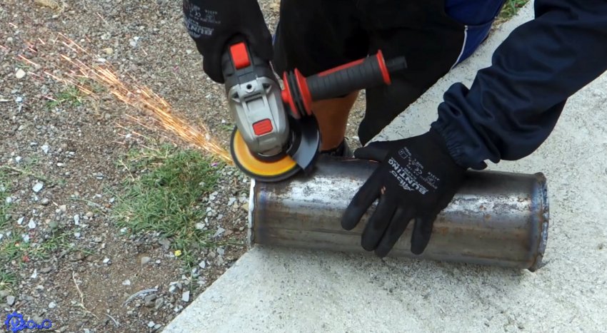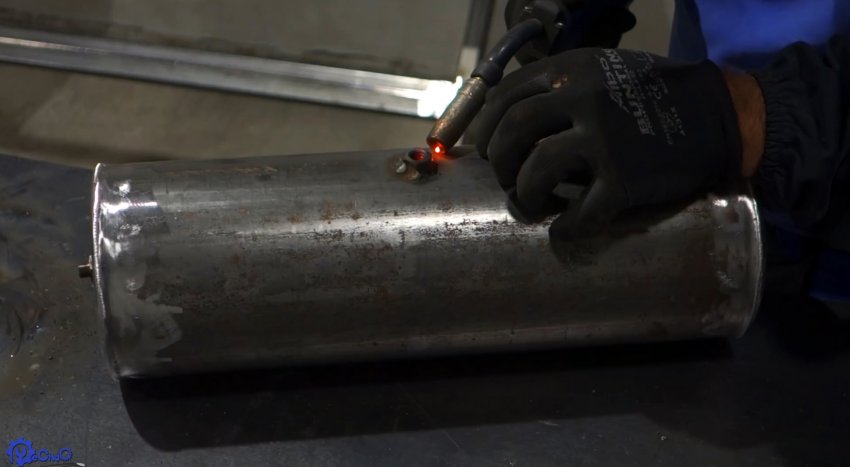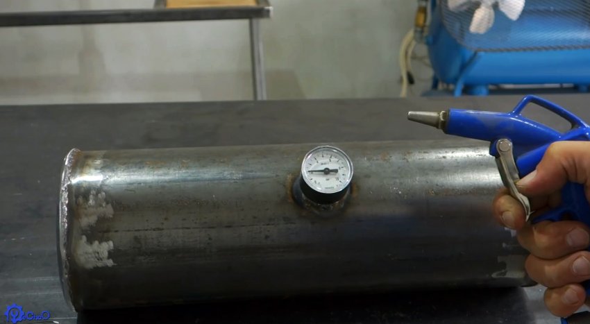 Чтобы раздувать угли, можно сделать баллон и закачать его сжатым воздухом. Он сваривается из толстостенной трубы 120-200 мм и листовой стали. Его нужно просверлить сбоку и с торца. В боковое отверстие вваривается гайка, и вкручивается манометр. Во второе вваривается штуцер для закачки воздуха и подсоединения шланга с продувочным пистолетом. Для удобства к баллону приваривается ручка с прутка.