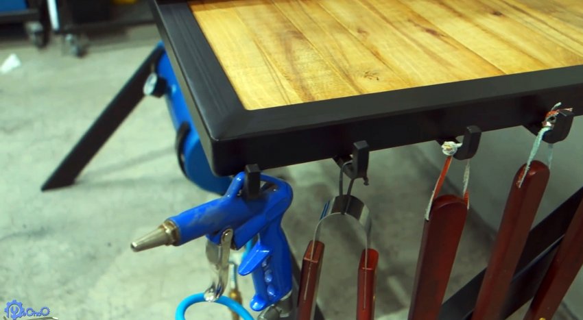 Из полосы выгибаются дуги и привариваются к поперечине на ножках стола, на них будет храниться баллон. Сбоку стола привариваются крючки с прутка для подвешивания лопаток, щипцов, скребков и прочих инструментов для барбекю.