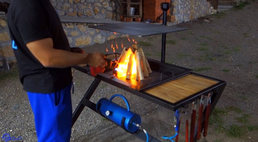 В жаровне разжигаются дрова или угли. Раздувать их можно воздухом из баллона. Для уменьшения его расхода, на шланг желательно установить регулировочный кран, так как без него все выйдет меньше чем за минуту. Получаем удобное рабочее место. Высота решетки регулируется ручкой домкрата, слева и справа есть поверхность для разделки мяса, установки кастрюлю, тарелок. Сбоку на крючках находятся все необходимые инструменты для распределения жара и переворачивания мяса.