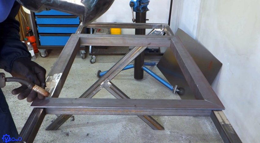 Из трубы 30х30 см сваривается рама рабочего столика. В нее вваривается 2 поперечные трубы. Между ними будет располагаться съемная жаровня, а с боков можно сделать разделочные поверхности.