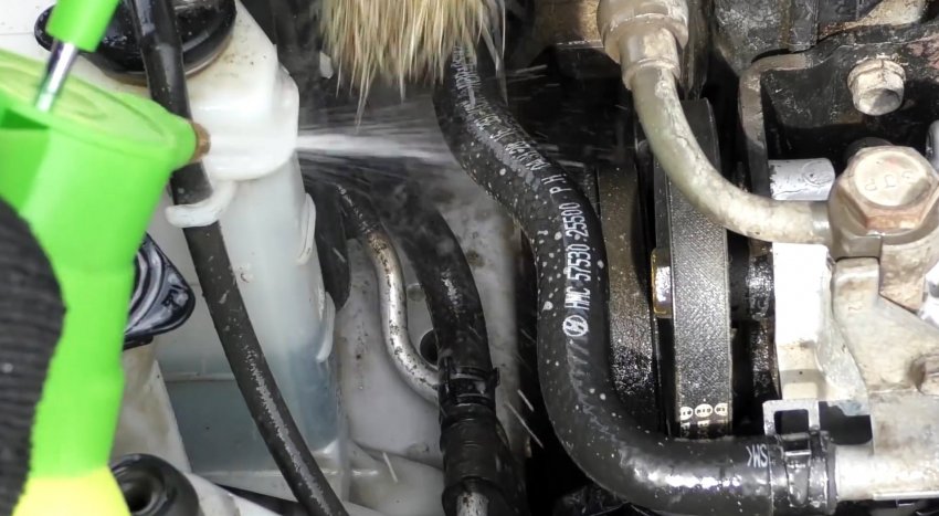 Из помпы смачивают окружение двигателя для растворения грязи.