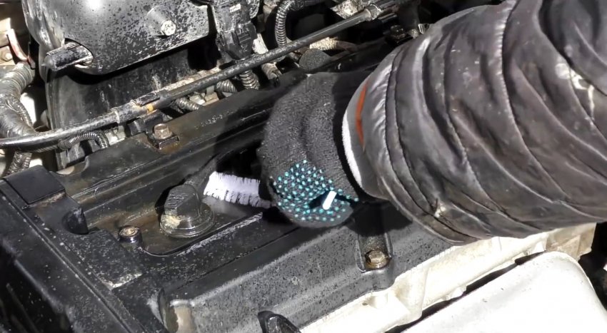 Очищают оставшиеся части и приступают к очистке клапанной крышки очистителем двигателя, щеткой и ершиком. Вытирают все сухой тряпкой, включая надсвечники.