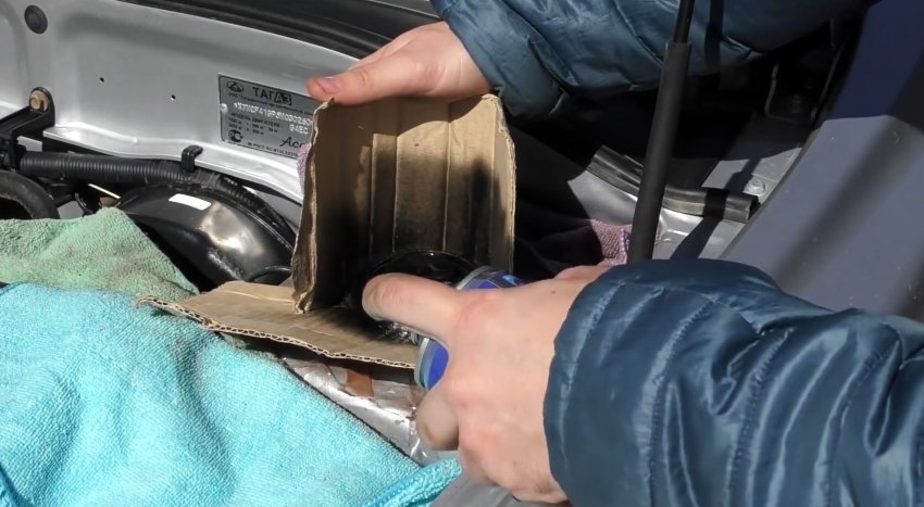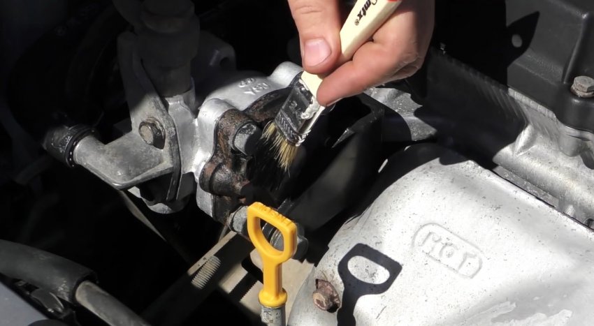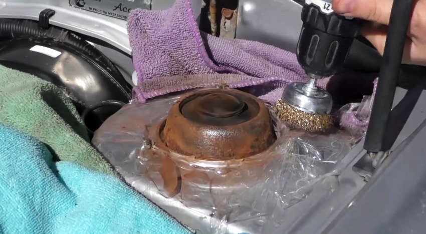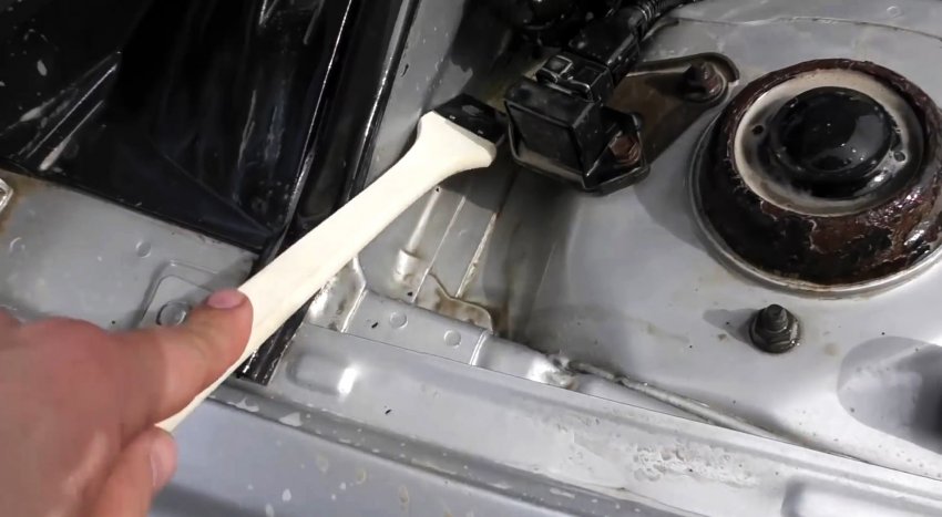 Завершают очистку покраской очернителем металлических частей, включая опорники амортизаторов, очищенных от ржавчины.