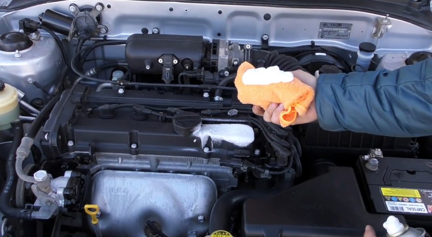 Пользуясь водой, смывают грязь и протирают микрофиброй. Снимают с двигателя пленку.
