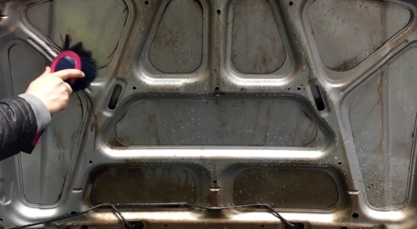 Смачивают капот водой с гелем и обрабатывают щеткой. Протирают микрофиброй для удаления воды.