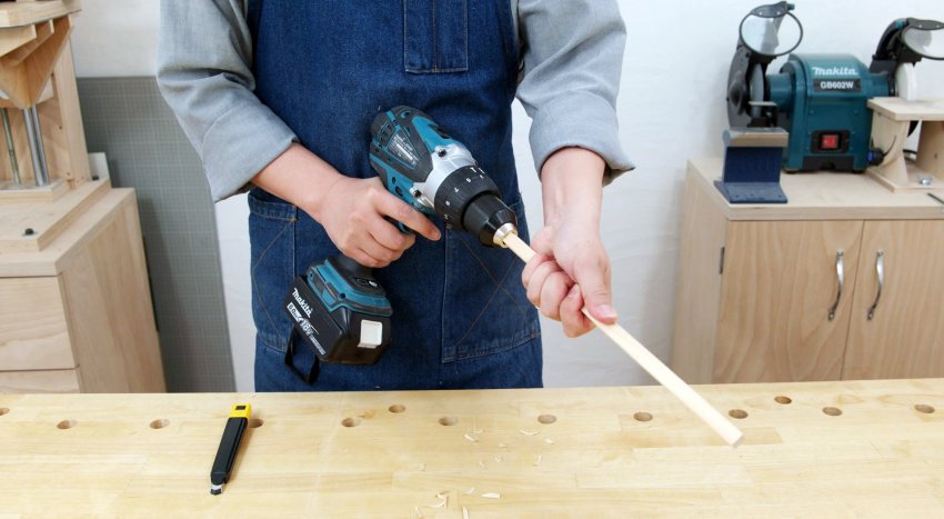 Ее край закругляется ножом, чтобы зажать его в патрон дрели. Затем запустив вращение, нужно прогнать заготовку через отверстие. Здесь важно, чтобы направление ее вращения шло на острия зубьев полотен, поэтому если рез не происходит, то их нужно развернуть.