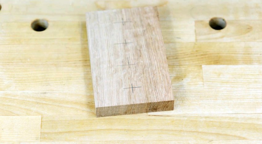 Вдоль заготовки по центру с отступом 20 мм от края и таким же шагом, в одну линию просверливаются отверстия под нарезку шкантов.