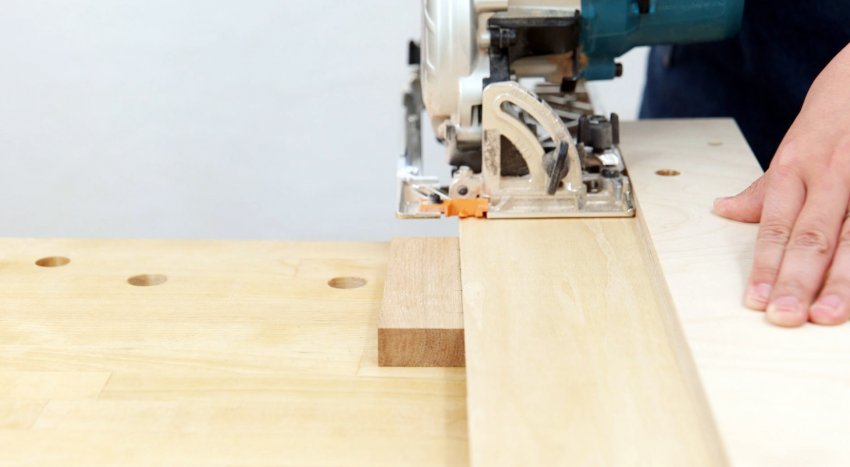 Пропил нужно выполнить более узким циркулярным диском, чем толщина полотен электролобзика. Чтобы заготовка при пилении не сдвинулась, ее можно временно приклеить к верстаку на двусторонний скотч.