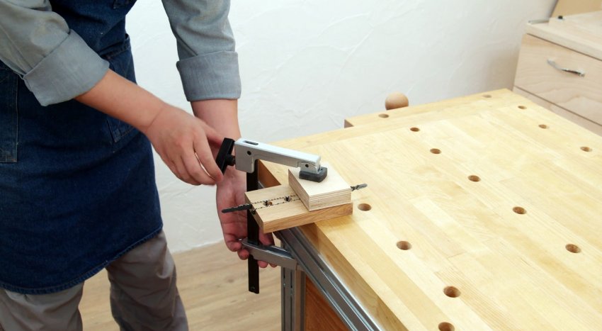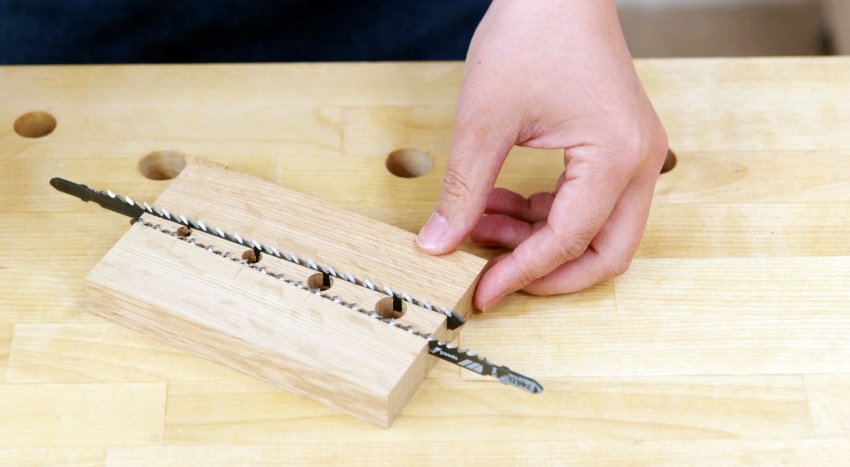 В полученные пропилы вставляются полотна от лобзика, и кондуктор зажимается на краю верстака струбциной.