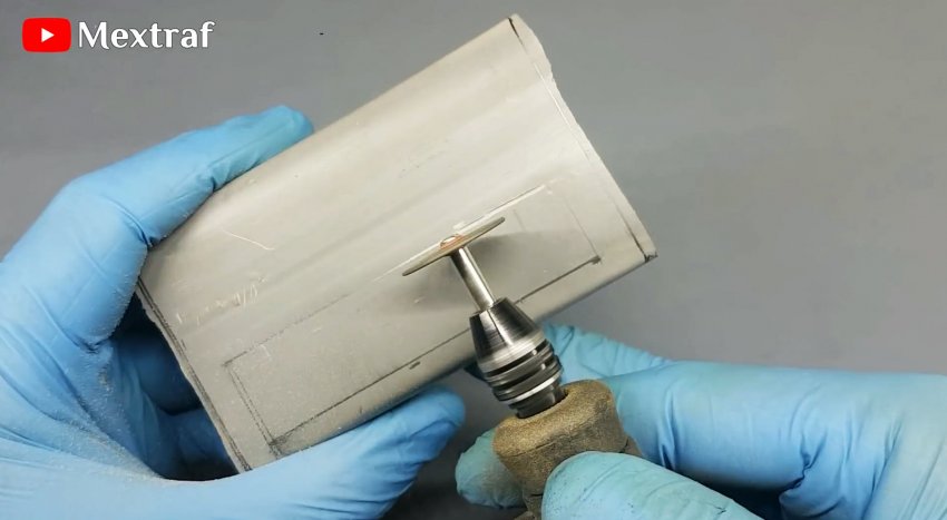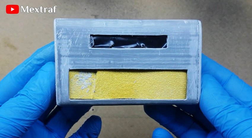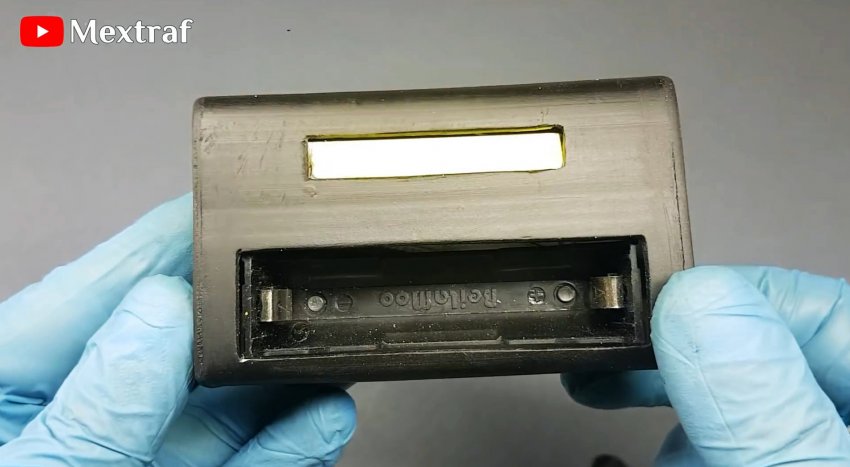 Прорезаем окошки под держатель АКБ и светодиод. Вырезаем боковые заглушки. Устанавливаем всю начинку внутрь корпуса и приклеиваем.