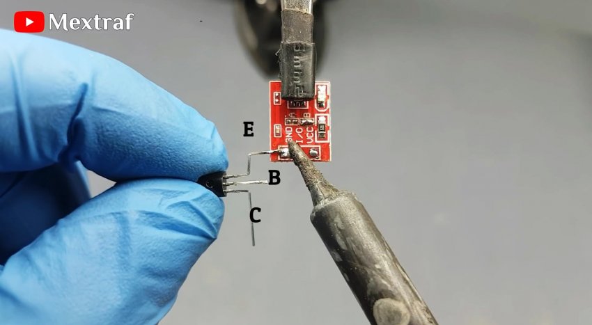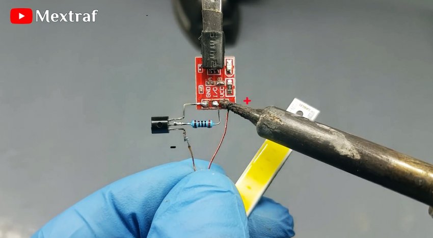 Подключается модуль очень просто по 3 контактам: по бокам питание, в центре выход логического состояния. На транзисторе соберем ключ для коммутации светодиодной полоски. Припаиваем транзистор прямо к плате.