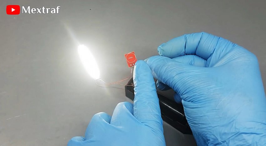 Припаиваем провода от светодиодной линейки через транзистор и питание от аккумулятора. Устанавливаем АКБ в бокс и проверяем работу.