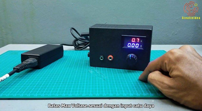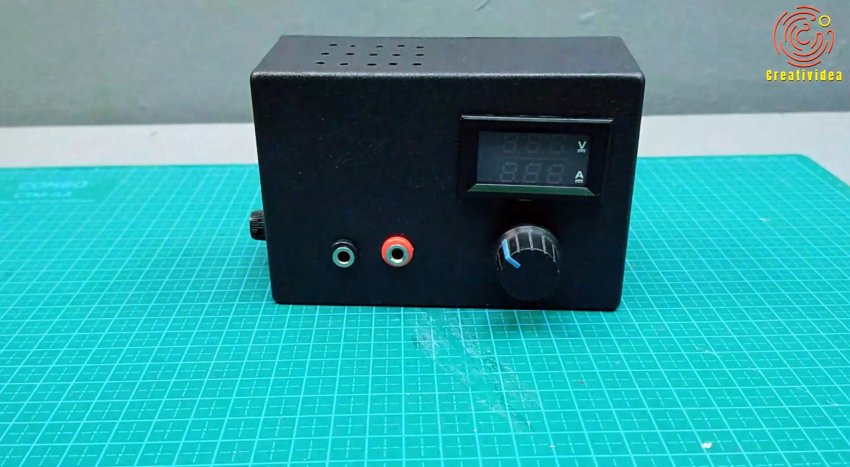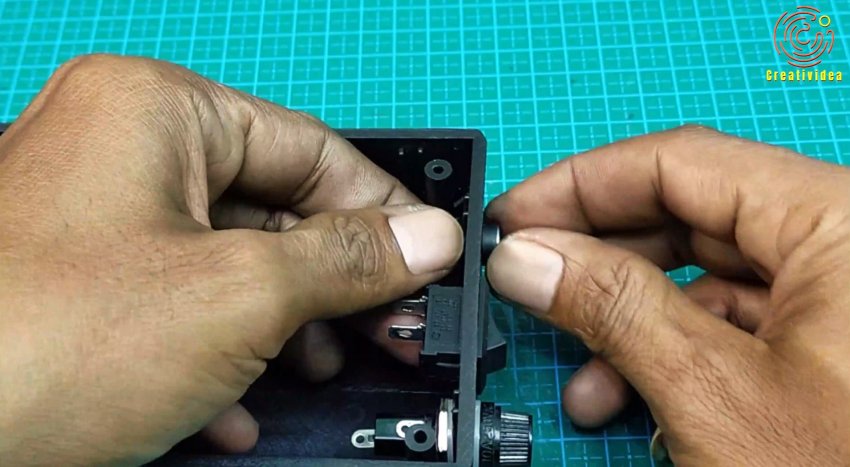 В корпусе на лицевой части прорезаем окна под ампервольтметр, переменный резистор, клеммы подключения.