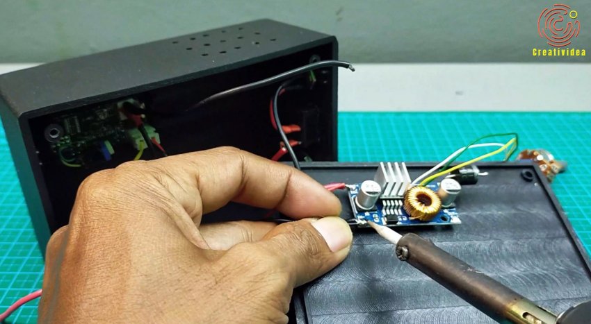 Преобразователь приклеиваем на двойной скотч к задней стенке корпуса. Сверху сверлим отверстия для вентиляции.